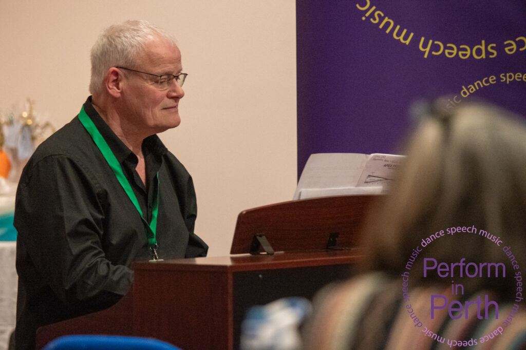 Scottish song featured strongly later in the programme. In the Scots Songs – Soprano (18 & over) class, Irene McFarlane performed There Was a May and The Queen’s Maries, both arranged by J. Michael Diack. In the Scots Songs – Bass (18 & over) class, Bruce Paterson sang Bonnie George Campbell and Burns’ Ae Fond Kiss.