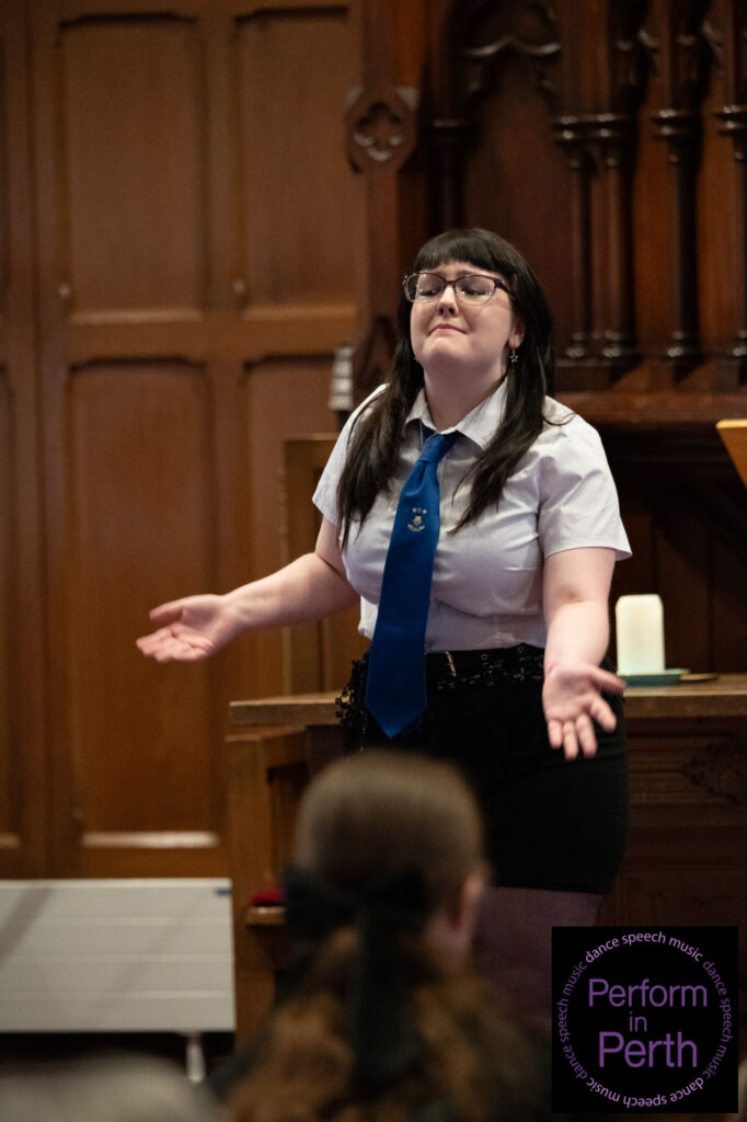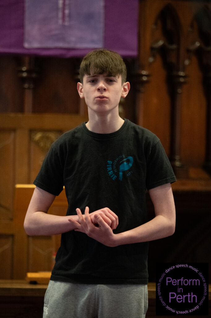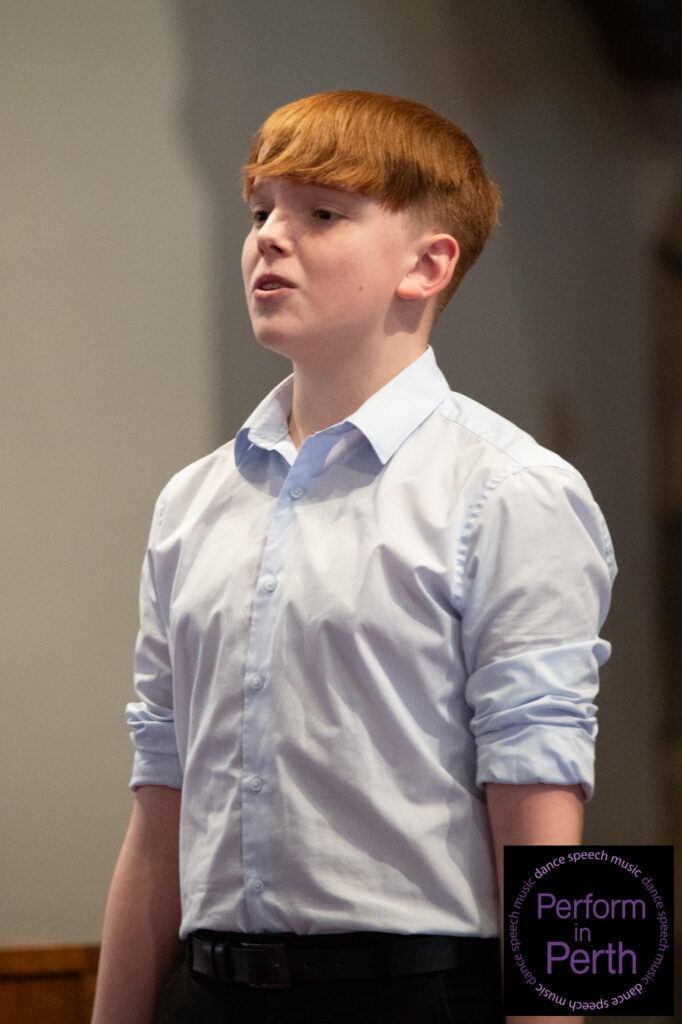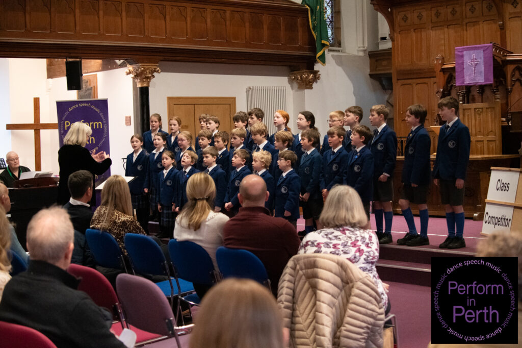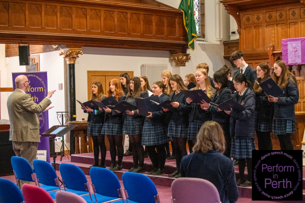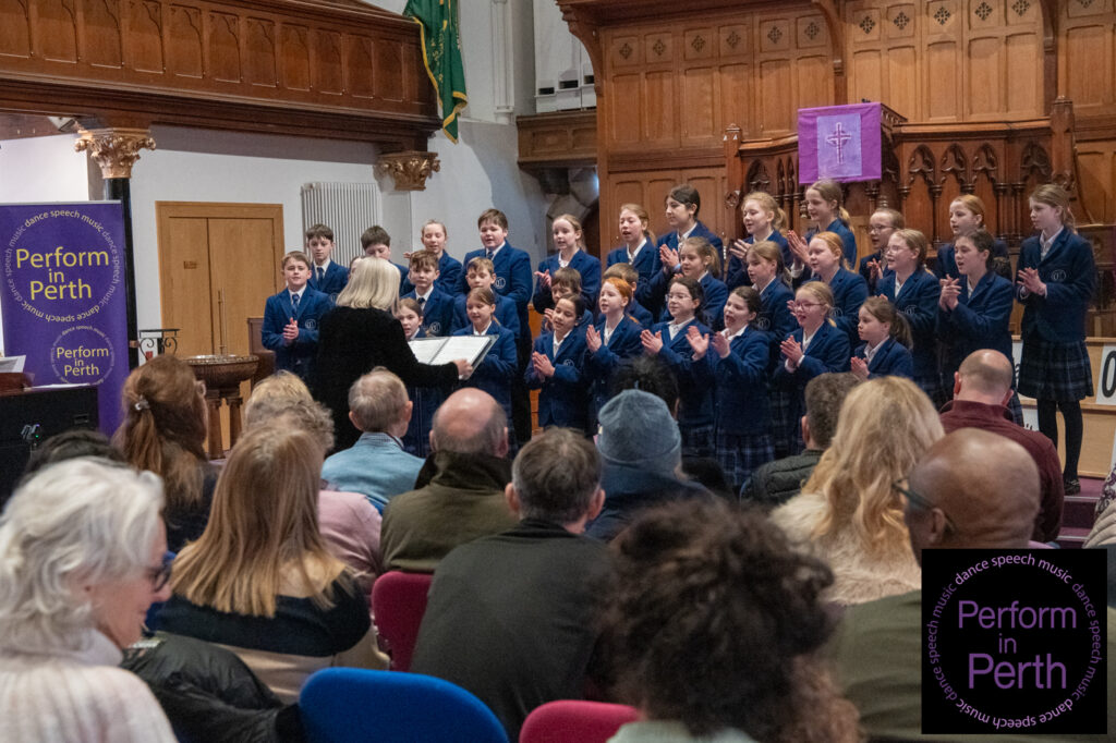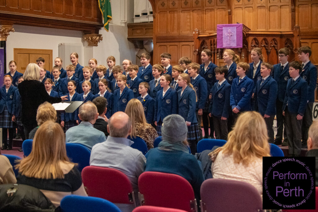 The final class of the session, Class 075 (Mixed Voices up to S6), was won by the Strathallan School Choir, conducted by Jeff Wilson. Their performances of Homeward Bound by Marta Keen (arranged by Althouse) and Falling Water by Rollo Dilworth were commended for their balance, expressive singing and musical maturity, earning them the Trophy presented by Mrs William Gray.